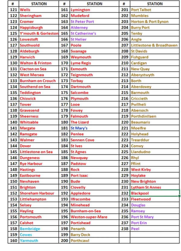 Littlehampton, Beaumaris, St. Agnes, North Berwick, Portaferry, Cleethorpes and Fishguard.